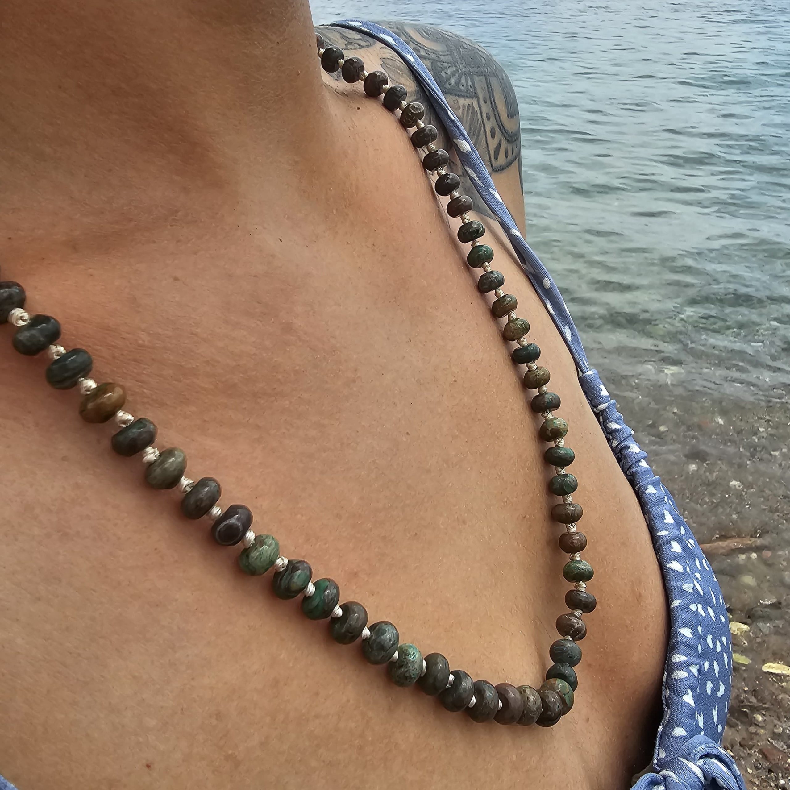 הטורקיז האפריקאי ידוע כאבן של חיבור פנימי, ריפוי ואנרגיה מרגיעה, מה שהופך את השרשרת הזו לא רק לפריט אופנתי אלא גם לתכשיט עם משמעות עמוקה.